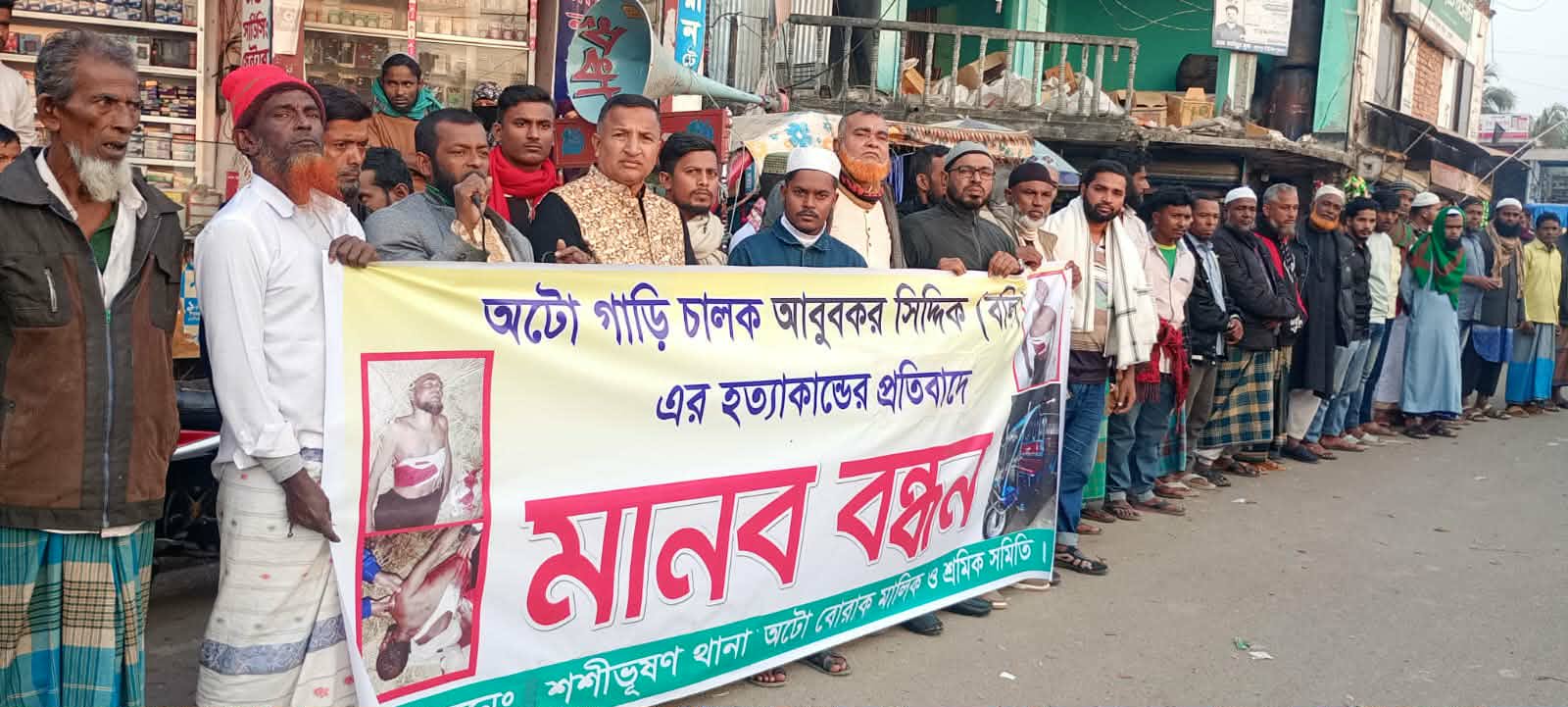 অটো চালককে হত্যাকান্ডের প্রতিবাদে জড়িতদের গ্রেফতারের দাবিতে মানববন্ধন
