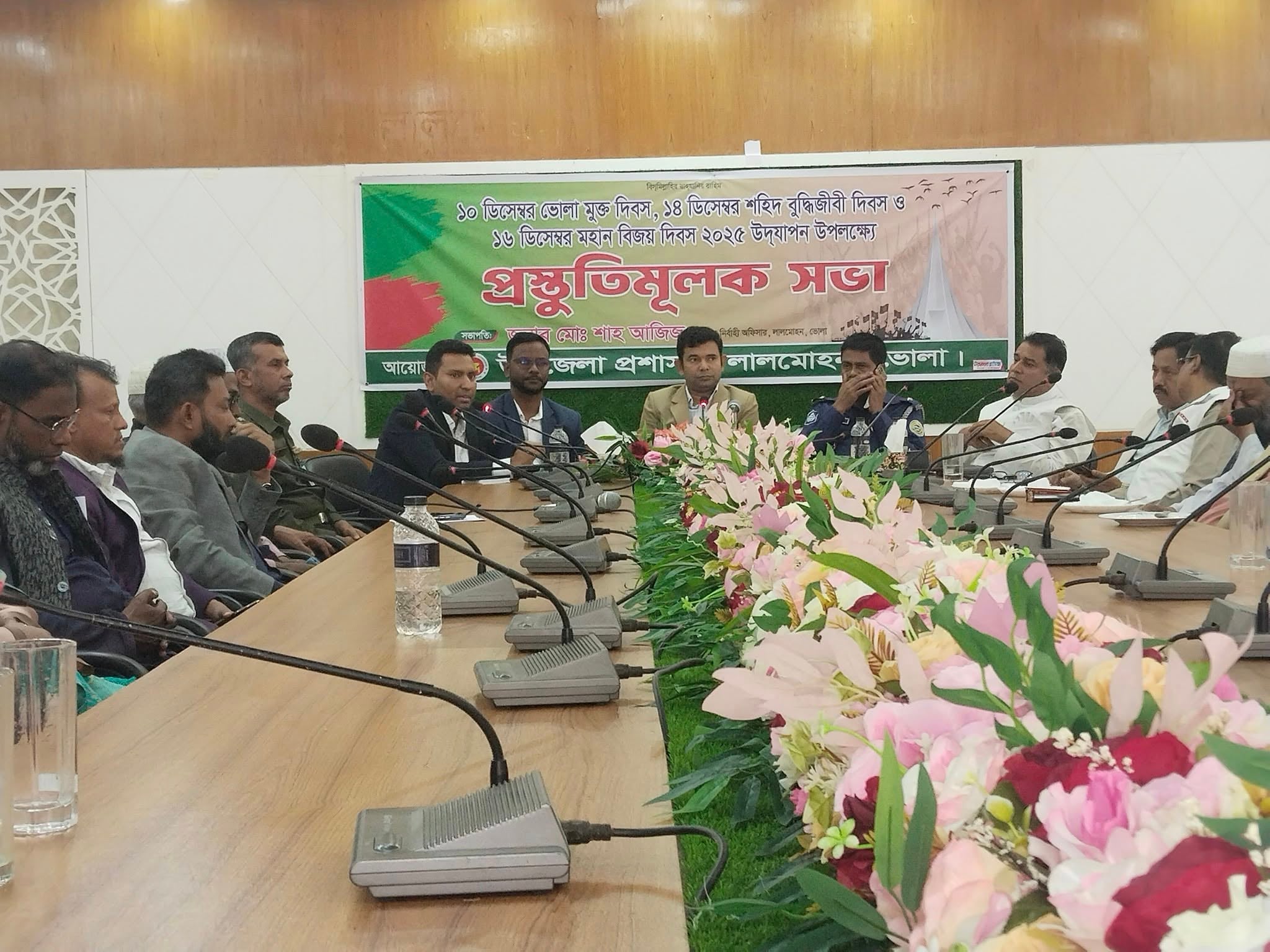 ভোলার লালমোহনে ভোলা মুক্ত দিবস (১০ ডিসেম্বর), শহিদ বুদ্ধিজীবী দিবস (১৪ ডিসেম্বর) ও মহান বিজয় দিবস (১৬ ডিসেম্বর) ২০২৫ উদযাপন উপলক্ষে লালমোহন উপজেলা প্রশাসনের উদ্যোগে এক প্রস্তুতিমূলক সভা অনুষ্ঠিত হয়েছে।