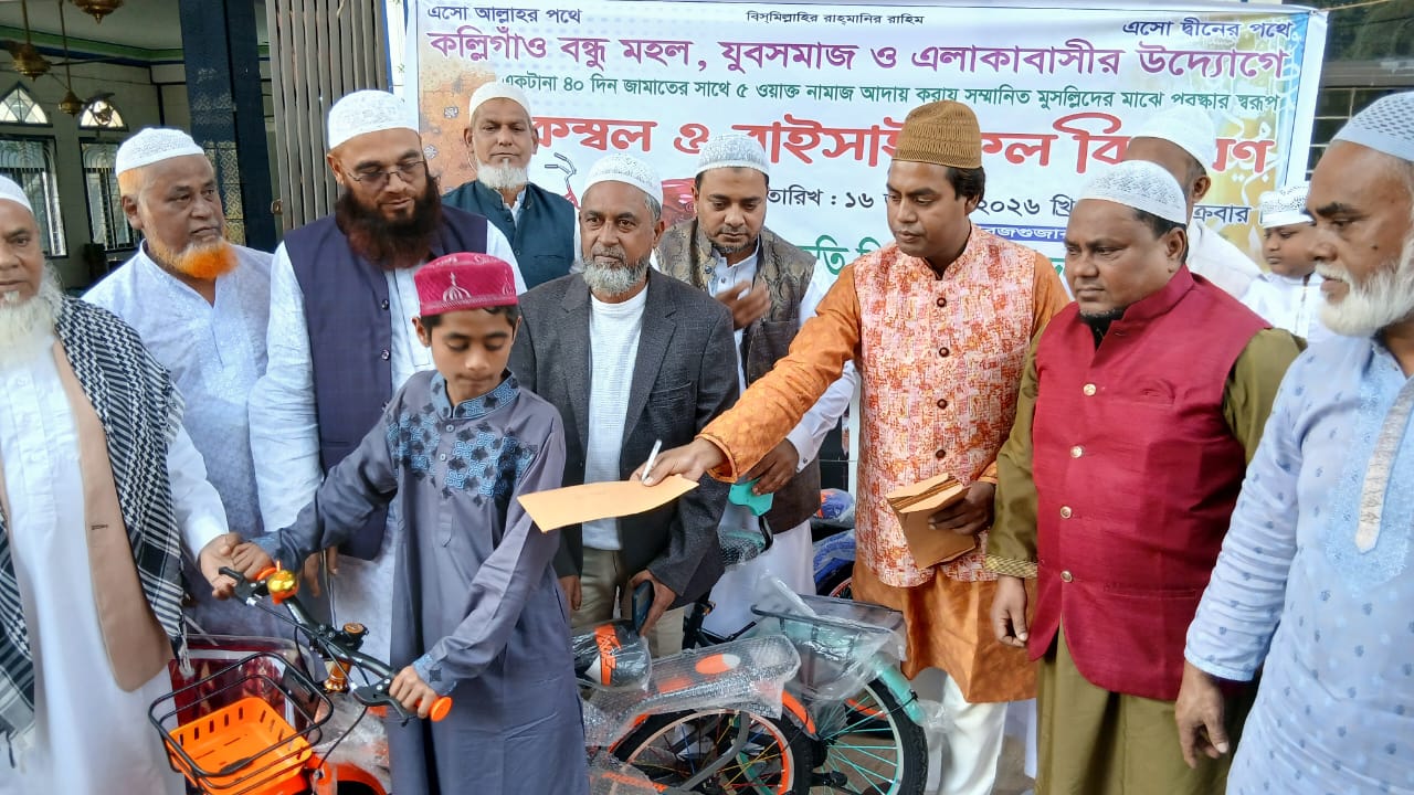 শুক্রবার বাদ জুম্মা উপজেলার কল্লিগাঁও ফোরকানিয়া জামে মসজিদ ও মাদ্রাসা পরিচালনা কমিটির উদ্যোগে এলাকার বন্ধু মহল, যুব সমাজ ও এলাকাবাসী ব্যবস্থাপনায় এই আয়োজন করা হয়। এদিন শিশু মুসল্লীদের ১০টি বাইসাইকেল বিতরণ করা হয় এবং বয়স্ক মুসল্লীদেরকে উন্নতমানের কম্বল প্রদান করা হয়।