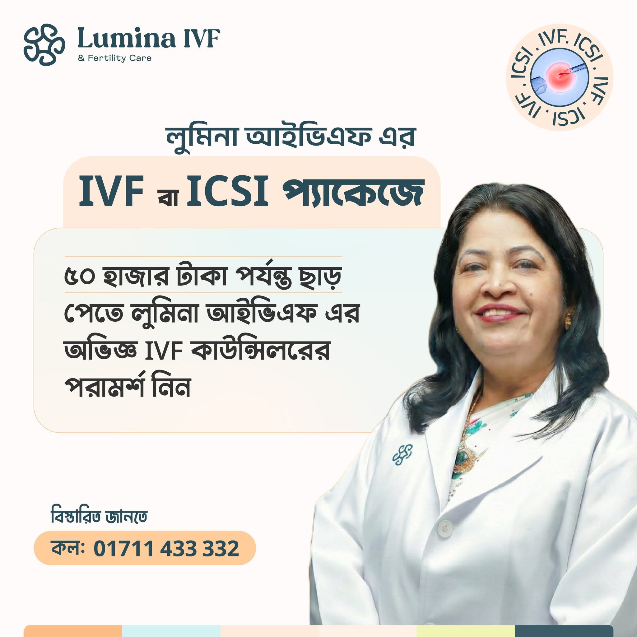 আমরা বুঝি, এই যাত্রাটি কতটা আবেগের। তাই আপনার এই যাত্রাকে সহজ করতে লুমিনা আইভিএফ-এর IVF বা ICSI প্যাকেজে ৫০,০০০ টাকা পর্যন্ত ছাড়! ✨