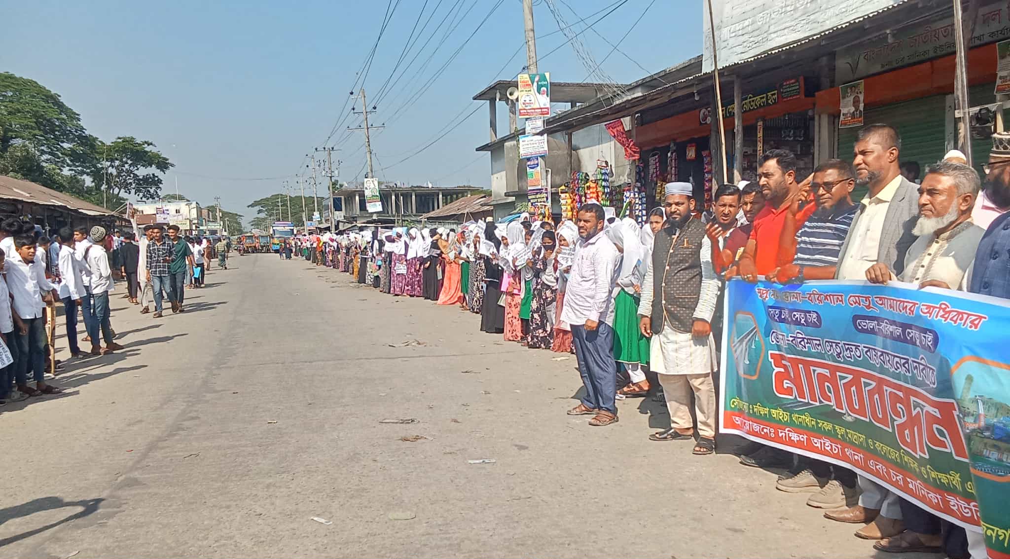 ভোলা-বরিশাল সেতু না হলে কঠোর কর্মসূচির হুঁশিয়ারি, দক্ষিণ আইচায় উত্তাল মানববন্ধন