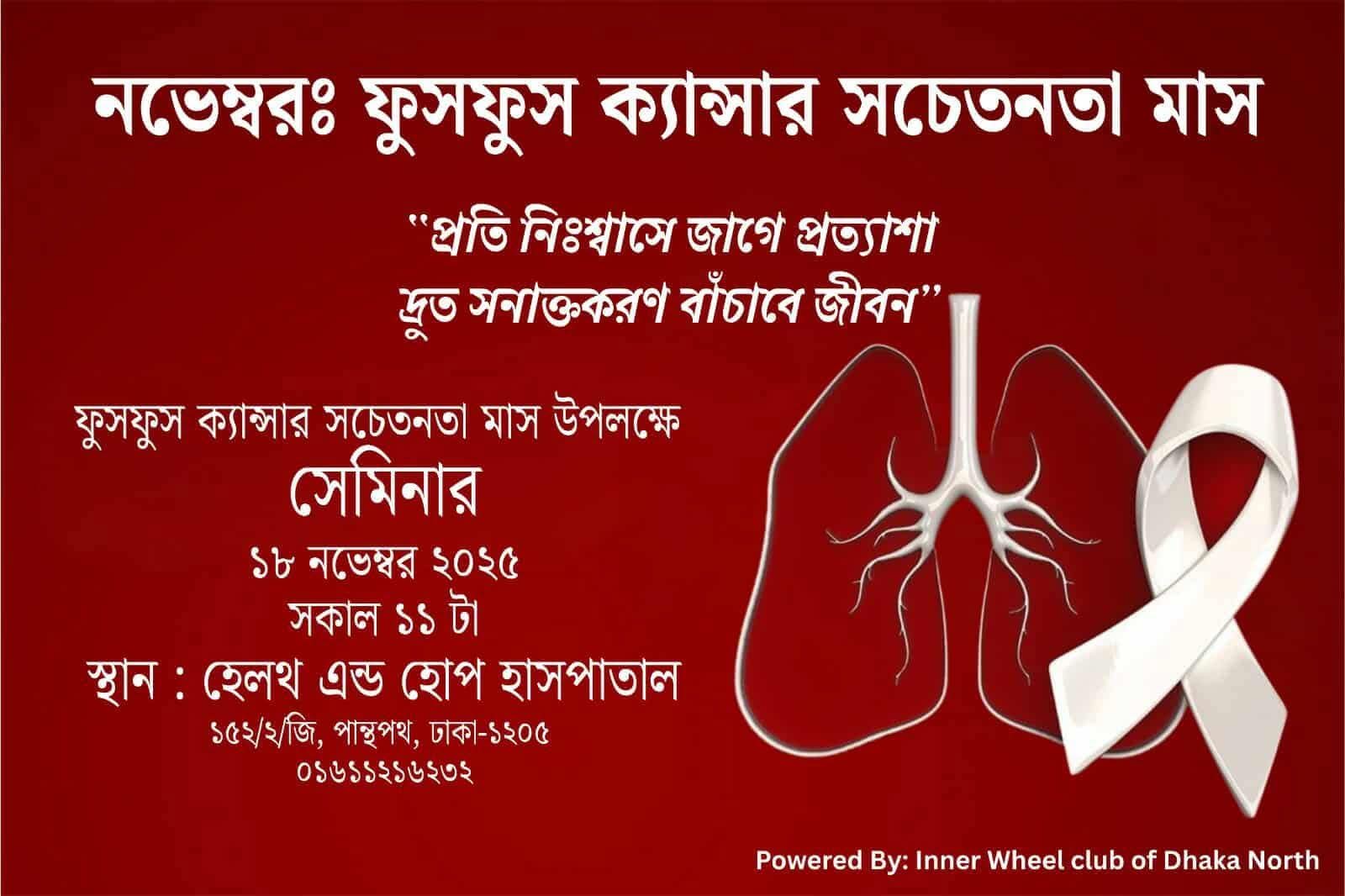 রাজধানীর হেলথ এন্ড হোপ হাসপাতালে ১৮ নভেম্বর বিশেষজ্ঞ ডাক্তারদের প্যানেল ব্যাখ্যাসহ জানাবে ফুসফুস ক্যান্সার ও প্রতিরোধের উপায়